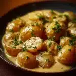 Delightful baby potatoes coated in a rich garlic cream sauce, perfect for a cozy dinner or gathering.