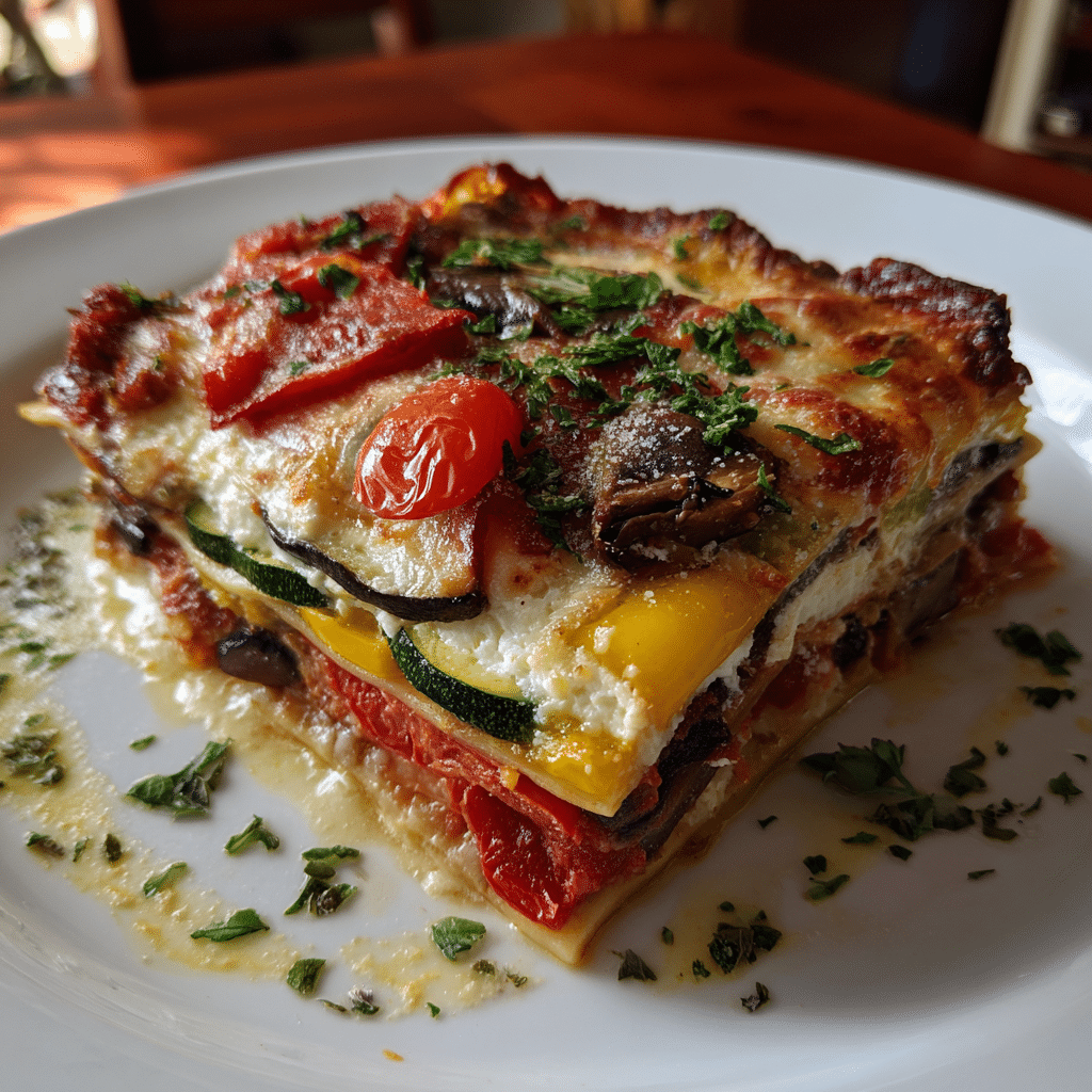 A rich, creamy, Mediterranean-style vegetable lasagna layered with roasted veggies, herbs, and smooth ricotta.