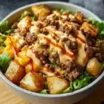 A flavorful and hearty Smash Burger Bowl that combines classic burger ingredients served over crispy potatoes for a healthier twist.