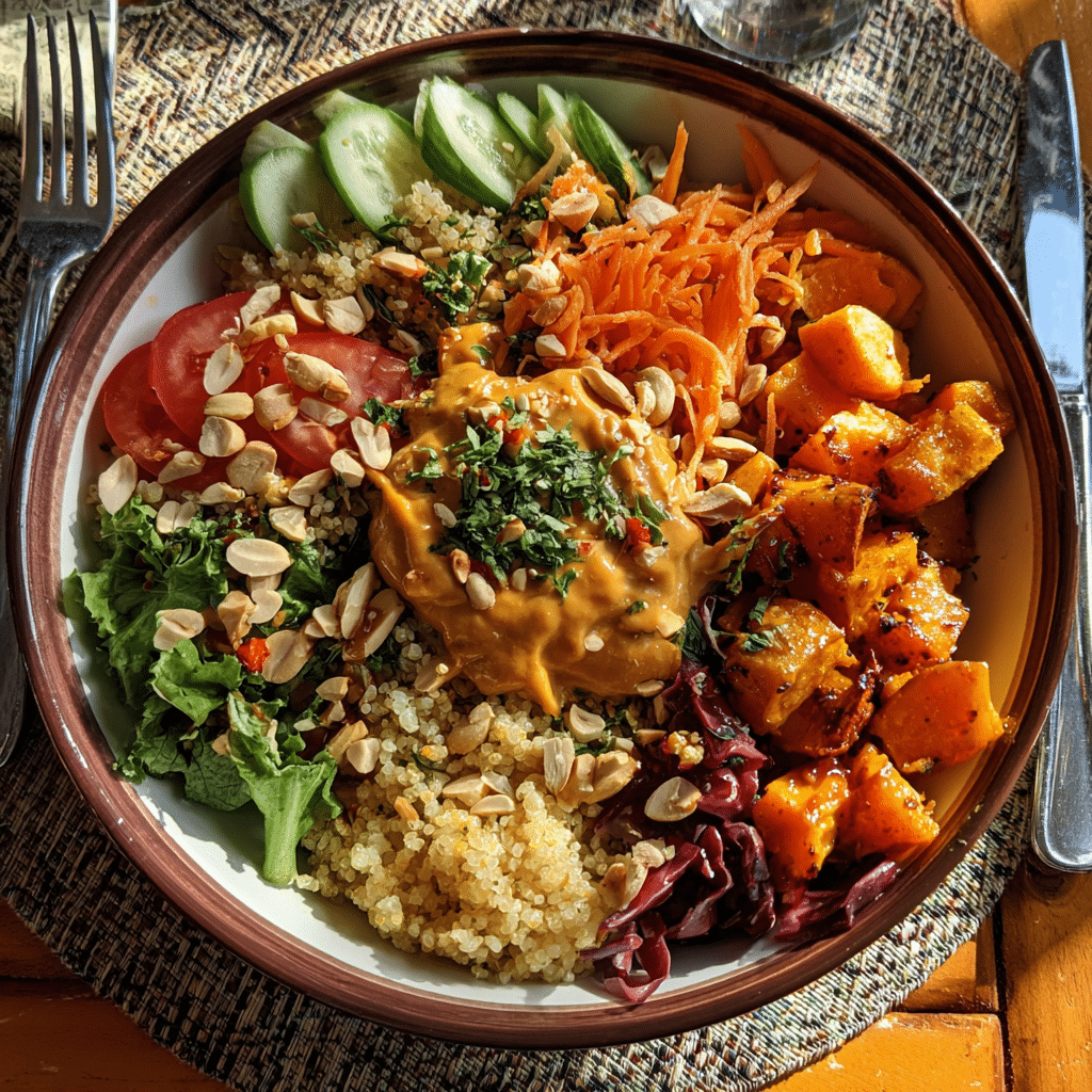 For pairing, this bowl plays well with light, refreshing beverages. Try an iced green tea, a crisp Riesling, or a hoppy IPA that complements the peanut sauce’s richness. If you’re serving this for dinner guests, prep all components in advance and let everyone build their own bowls it’s interactive and fun.